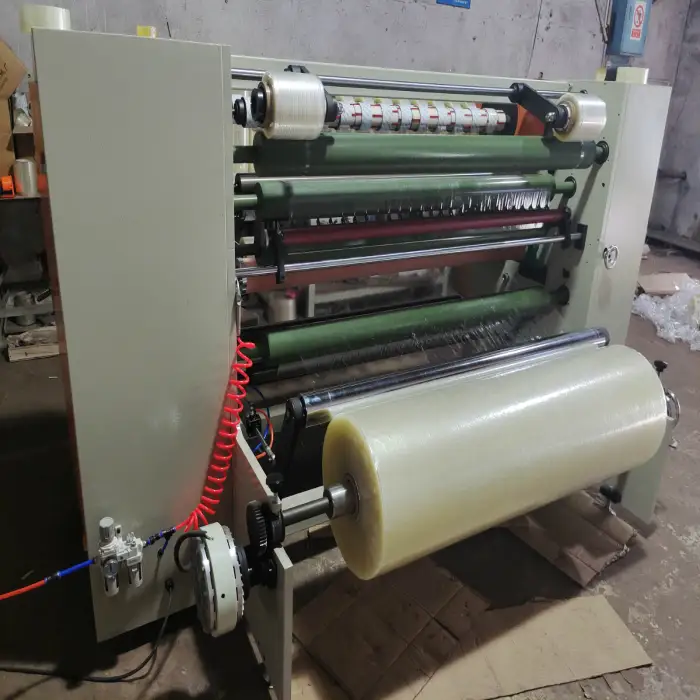 The machine uses 12 circular blades and employs pneumatic cutting technology for the slitting operation.