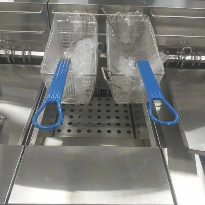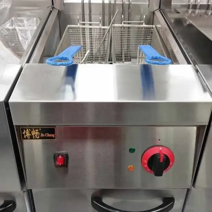 The fryer is made from durable stainless steel, ensuring a long service life and easy maintenance.