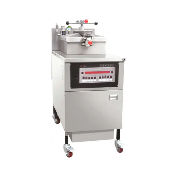 The fryer includes a computerized control panel for monitoring. Follow the manufacturer’s manual for all safety features (pressure relief, seals, interlocks). Safe practices include: never operate with damaged seals, keep vents clear, allow pressure to fully release before opening, and use PPE when handling hot oil. Always follow local safety codes.