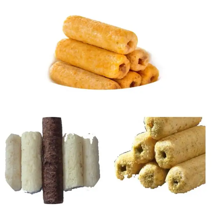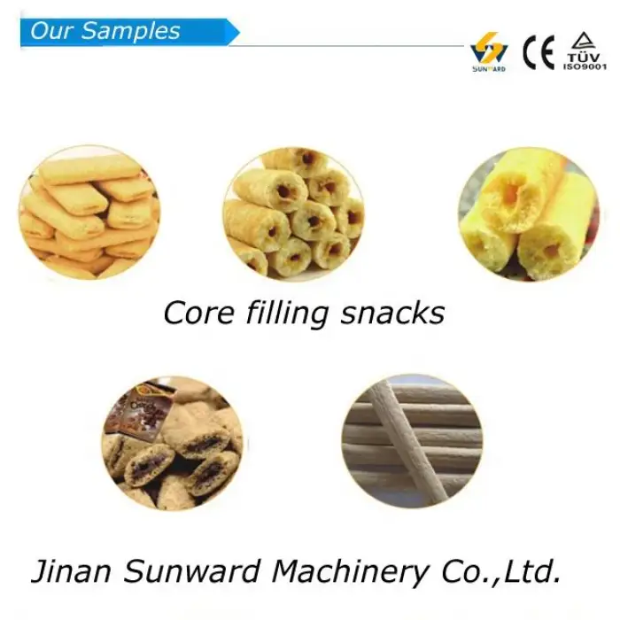 This machine can produce a variety of snacks including chocolate-filled snacks, cream-filled treats, and cheese ball sticks, as well as other core-filled snack foods.