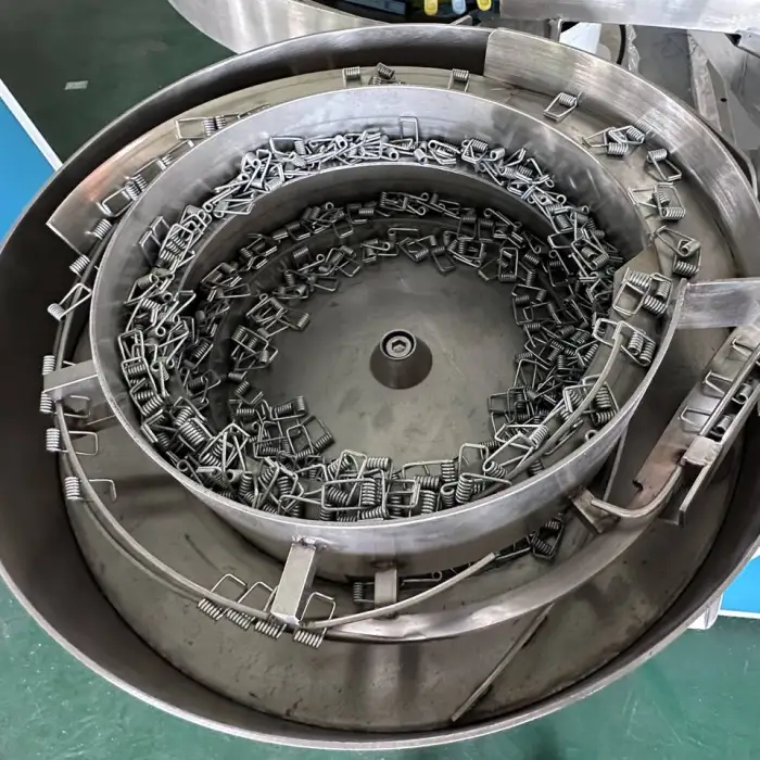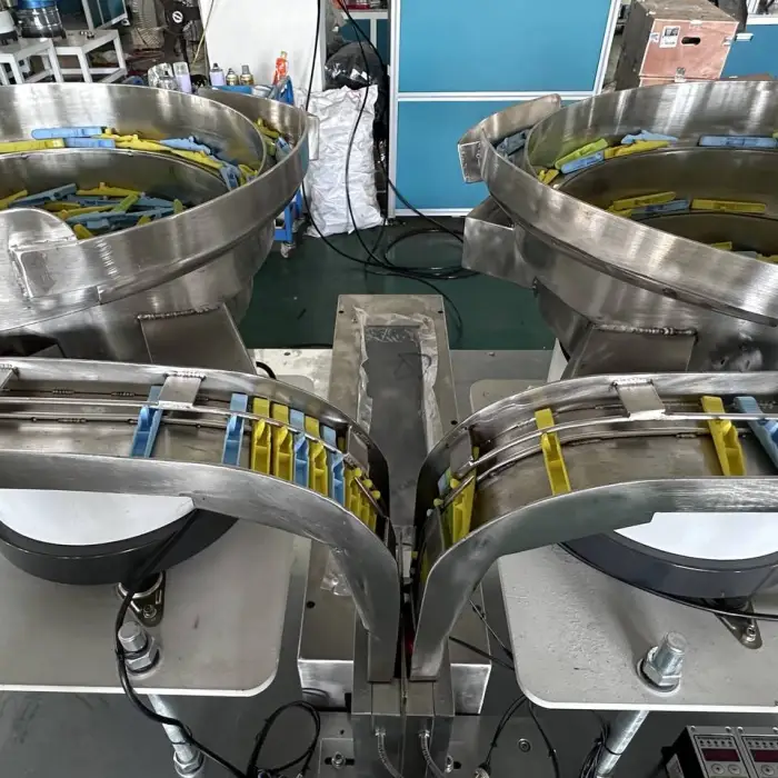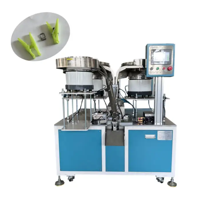 This is a full-automatic assembly machine designed for clothes clamps.