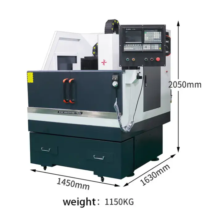 The dimensions of the CNC System VMC1160 are 1450 mm in length, 1630 mm in width, and 2050 mm in height.