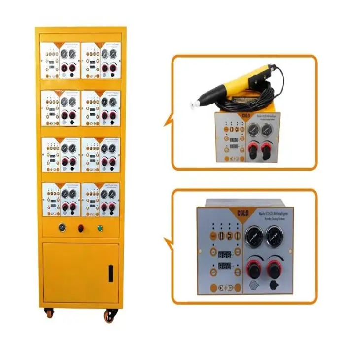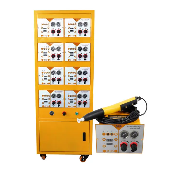 The COLO-800D-A is an automatic electrostatic powder coating spray gun machine designed for efficient, high-quality powder coating of steel substrates. It features PLC control for precise operation and is intended for industrial and commercial coating jobs.