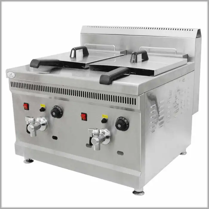 The fryer has a total capacity of 30 liters, with each tank holding 15 liters.