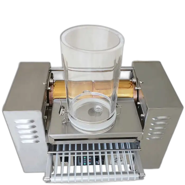 Layer size and thickness are typically determined by batter volume and machine settings. The unit is compact and intended for thin crepe/pancake skins used in mille crepe cakes; request technical details from the manufacturer if you need specific diameter or thickness control.