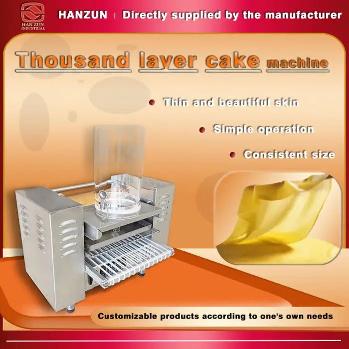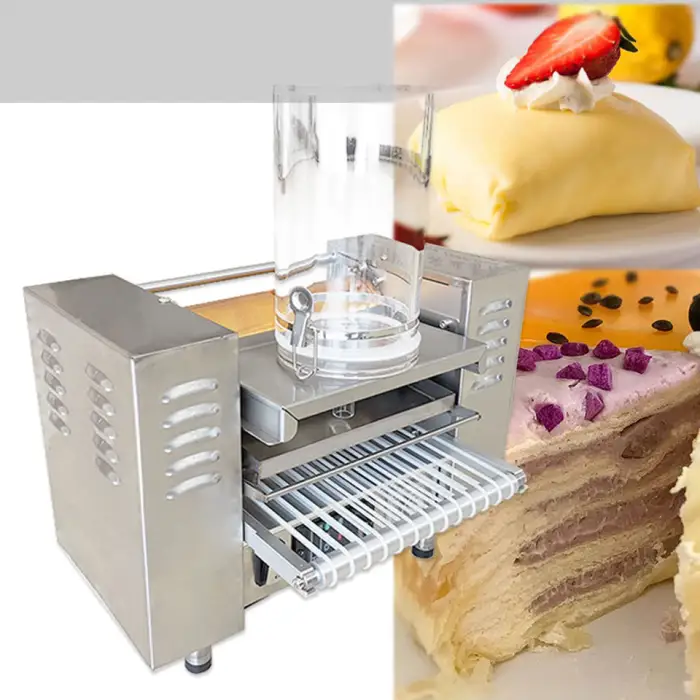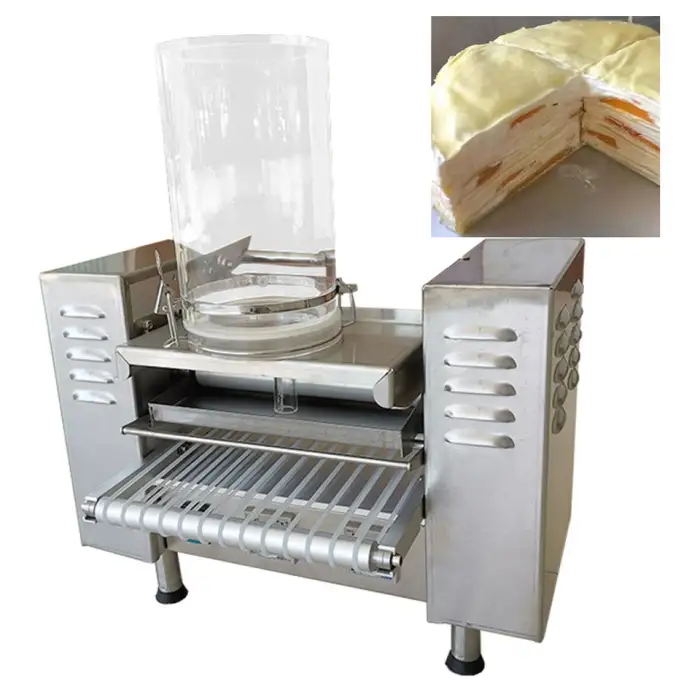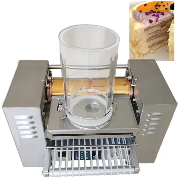 The machine is designed to make mille crepe (thousand layer) cakes and pancake skins/crepes for mille-feuille style desserts and similar thin-layer pancakes.