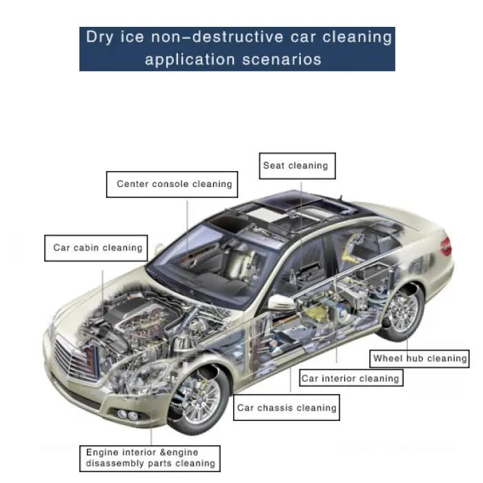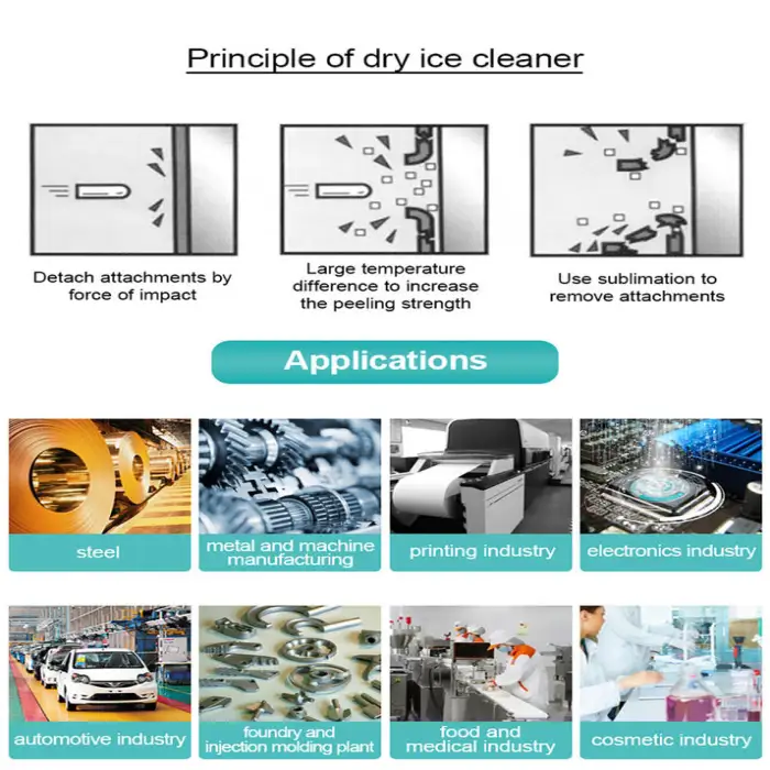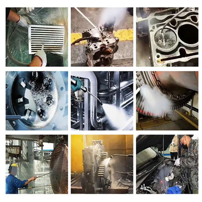 The dry ice blaster is suitable for cleaning auto parts and engines, removing grease and oil from machinery, restoring surfaces, cleaning delicate electronic components, and preparing surfaces for painting or coating.