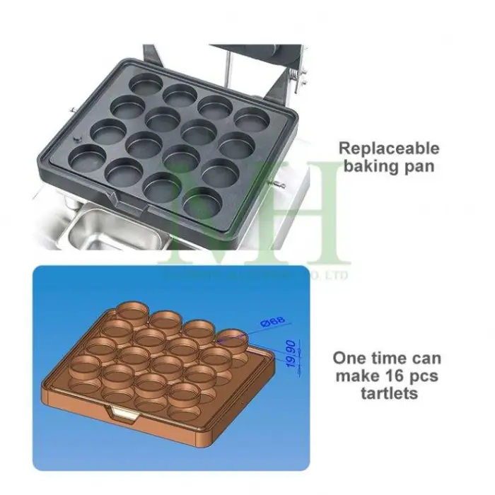 The Commercial Egg Tart Skin Making Machine can make mini tart pies, egg tarts, cupcake shells, and cookie cups.