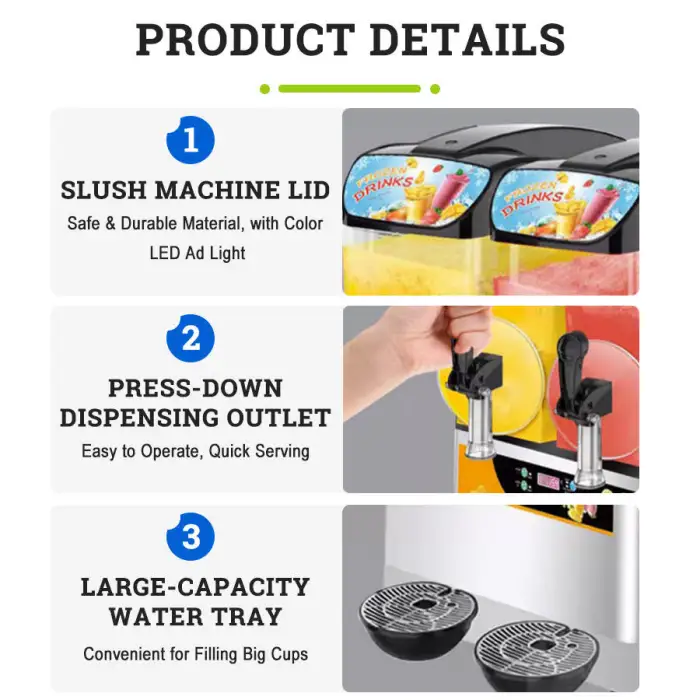 This slushie machine is perfect for cafes, bubble tea shops, restaurants, diners, events, parties, and convenience stores.