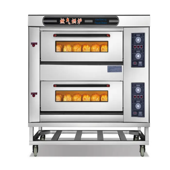 It is a commercial electric deck oven with two independent baking decks and four trays, designed for baking bread, pizza, cakes, buns and other bakery products in commercial kitchens and food production settings.