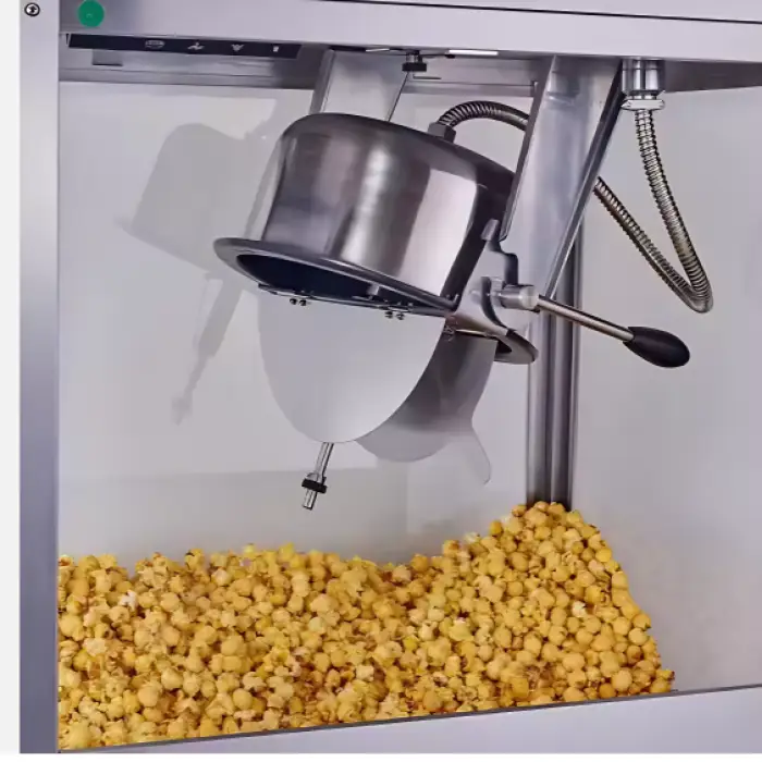 The popcorn machine is constructed from durable stainless steel, ensuring longevity and ease of cleaning.