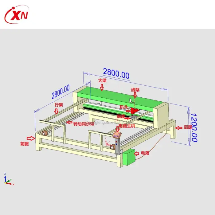 The machine's dimensions are 2.8 meters in length, 2.8 meters in width, and 1.2 meters in height.