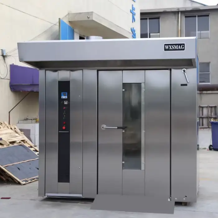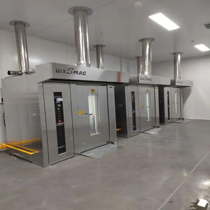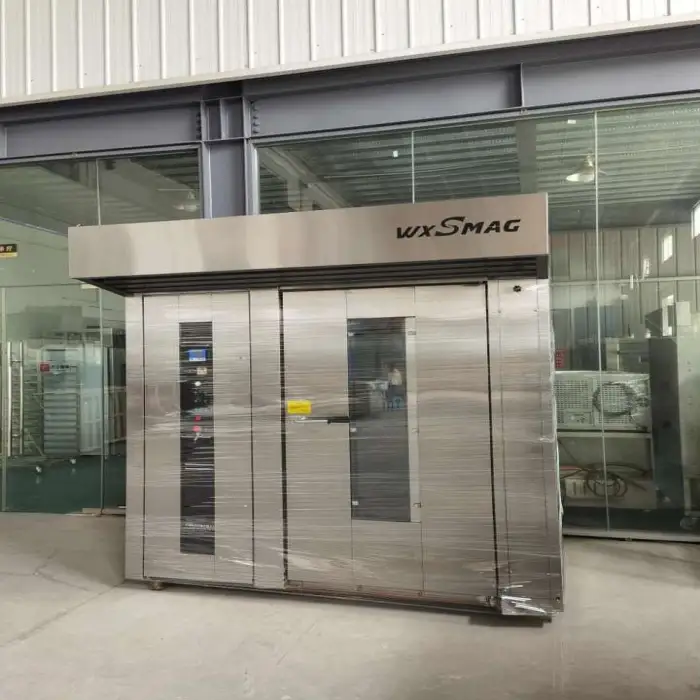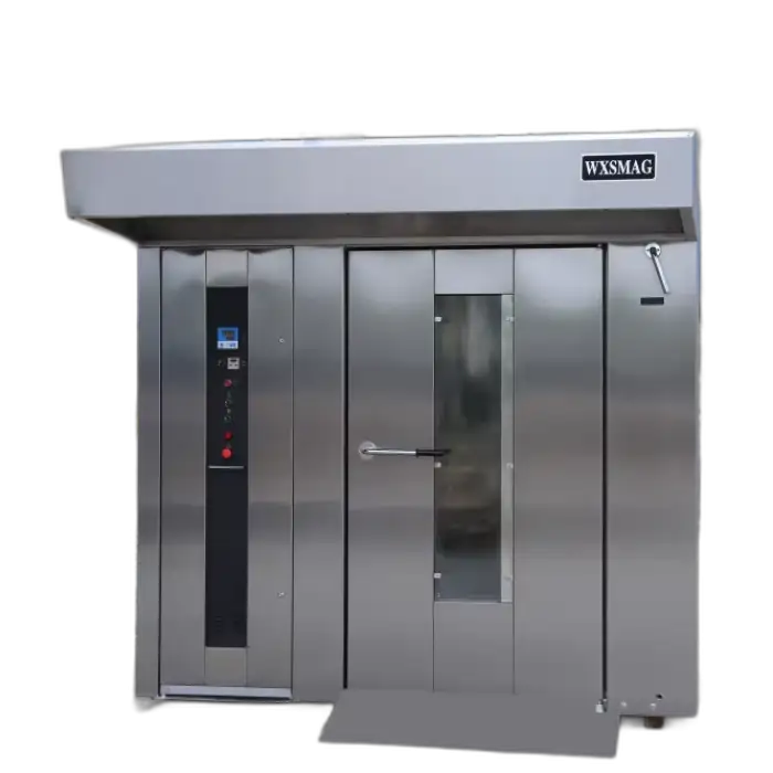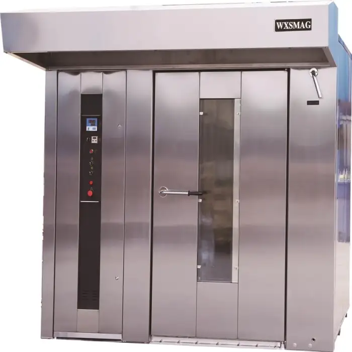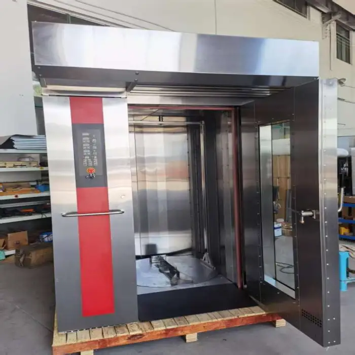 It uses a rotary rack oven (rotary). This design delivers even heat distribution, consistent baking across racks, and efficient throughput for continuous production runs.