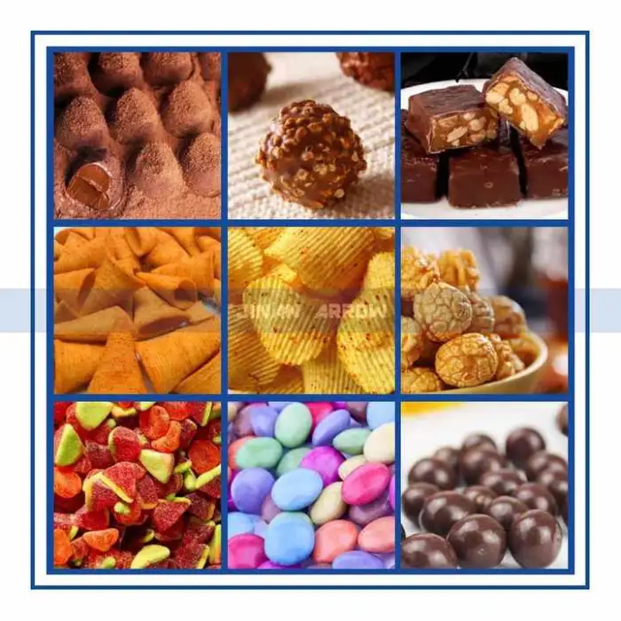 The Continuous Automatic Seasoning Coating Machine is designed to coat various snack types, including corn flakes, cereal snacks, snack chips, flavored puffed snacks, and unique snack mixes.