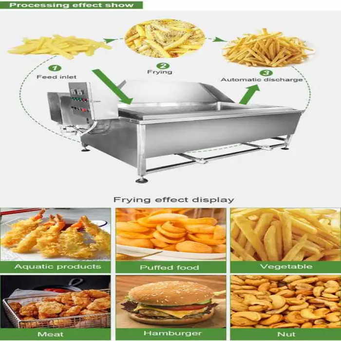 The Cooking of Fries Automatic Potato Chips Frying Machine is made from SUS304 stainless steel, which is durable and easy to clean.