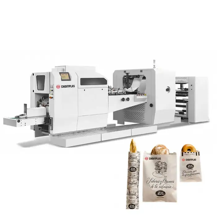 Key features include high productivity, low noise operation, long service life, high accuracy in bag production, and flexible manufacturing options for various bag sizes.