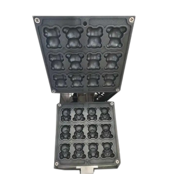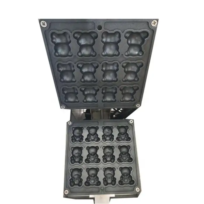 The product description does not specify plate coatings or removability. For cleaning, follow the supplier's manual. If non-stick plates or removable molds are important, request this information from the seller before purchase.