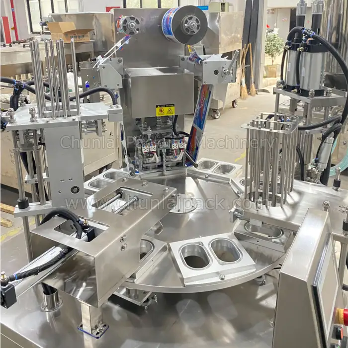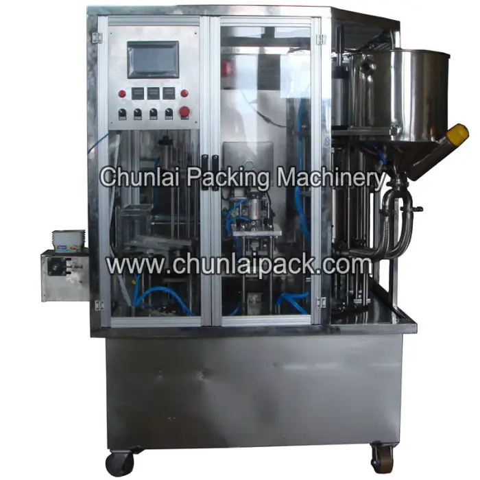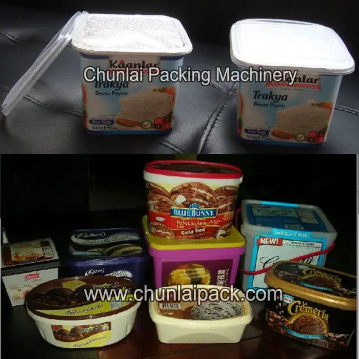 This machine is specifically designed for filling and sealing feta cheese cups, but it can also be used for other dairy products and similar applications.
