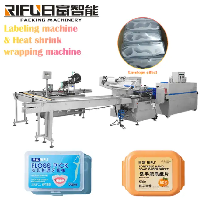 It is an automatic packaging and labeling machine designed to label the upper and lower surfaces of dental floss pick boxes, wrap them in transparent film, and perform heat shrink wrapping as part of a production line.