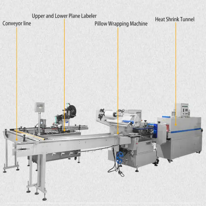 Yes — the described production line supports heat shrinking/wrapping. The heat shrink tunnel may be integrated or supplied as a matched unit; tunnel temperature and configuration are adjustable to suit the chosen film and product.