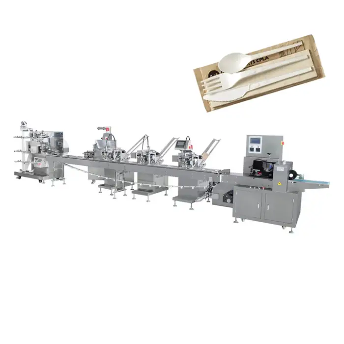 The machine is designed to package disposable utensils such as spoons, knives, and forks, as well as wet wipes.