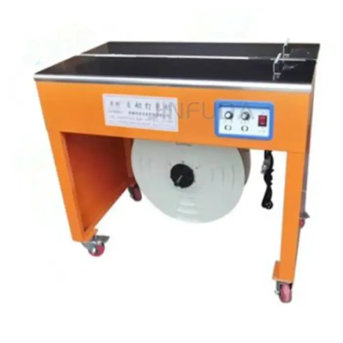 The machine is compatible with common plastic strapping materials (such as PP or PET). Exact compatible strap widths and thicknesses depend on model configuration — please contact the supplier to confirm supported strap sizes for your application.