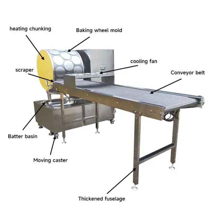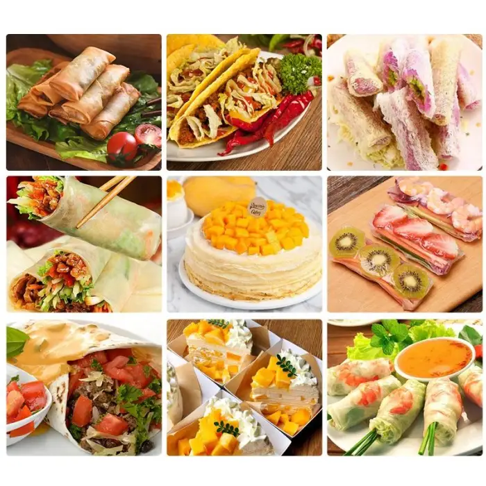 The machine is designed to produce crepes, thin layers for thousand-layer (crepe) cakes and spring roll wraps. It's suitable for crepe cakes, wraps and other thin-batter sheet products used in snack food production, bakeries, catering and food stalls.