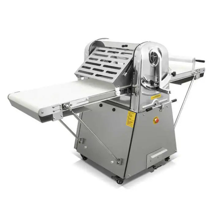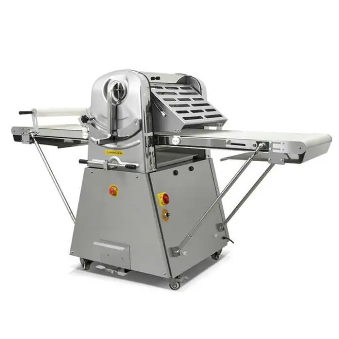 The Dough Sheeter Machine is constructed from food-grade stainless steel, ensuring durability and safety for food preparation.