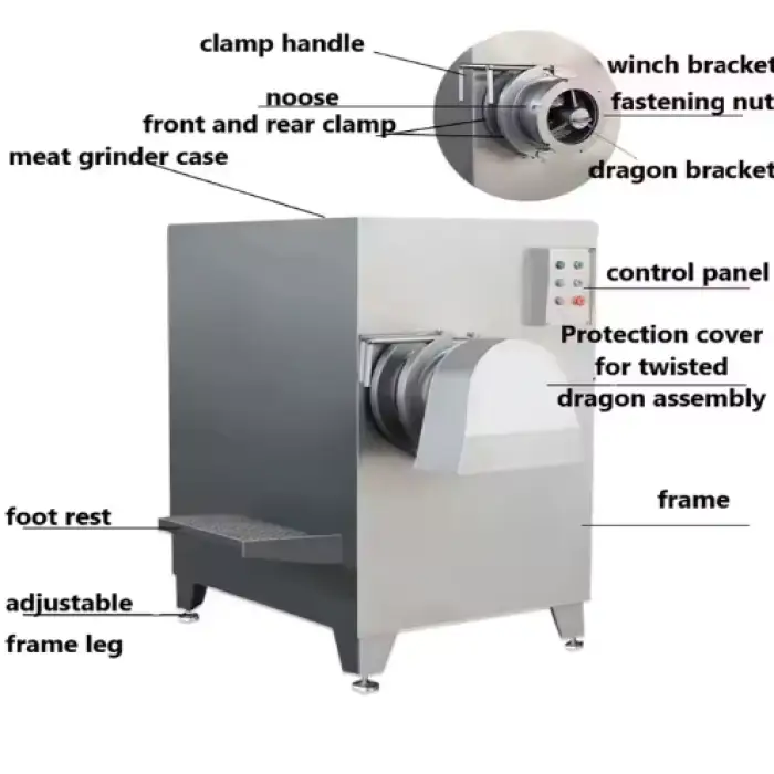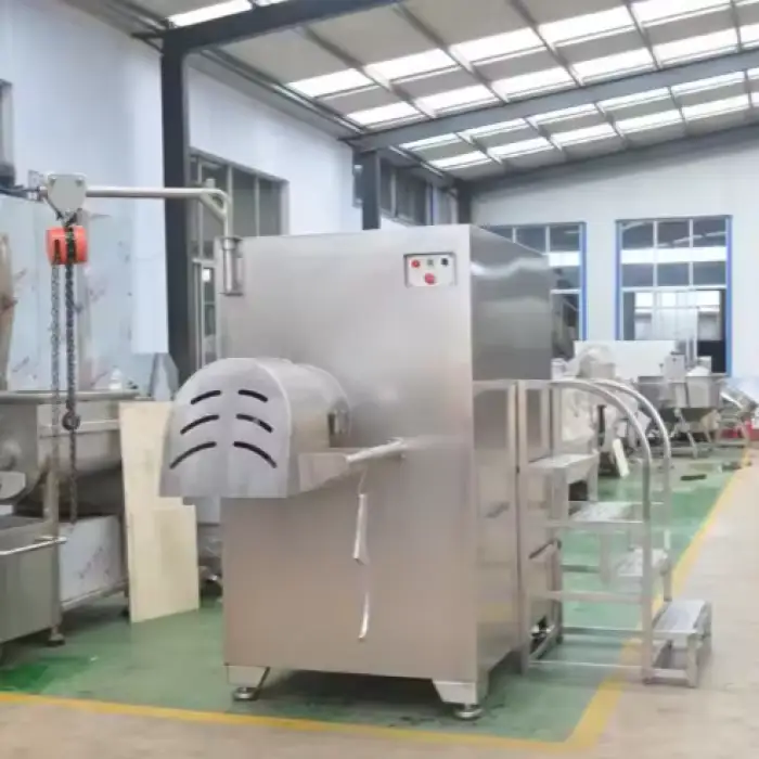 The machine is rated for high production capacity of approximately 500–1000 kg per hour. Actual throughput depends on meat type, grind plate size, and feed conditions.