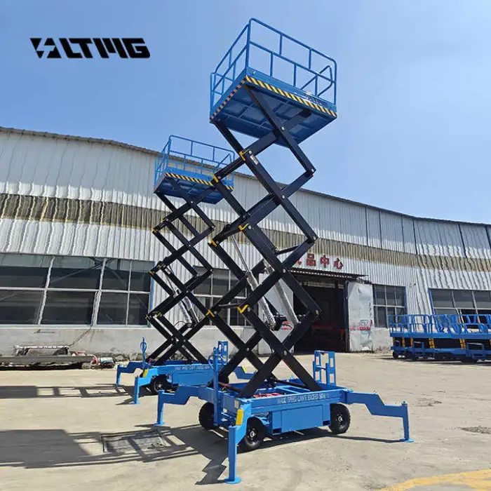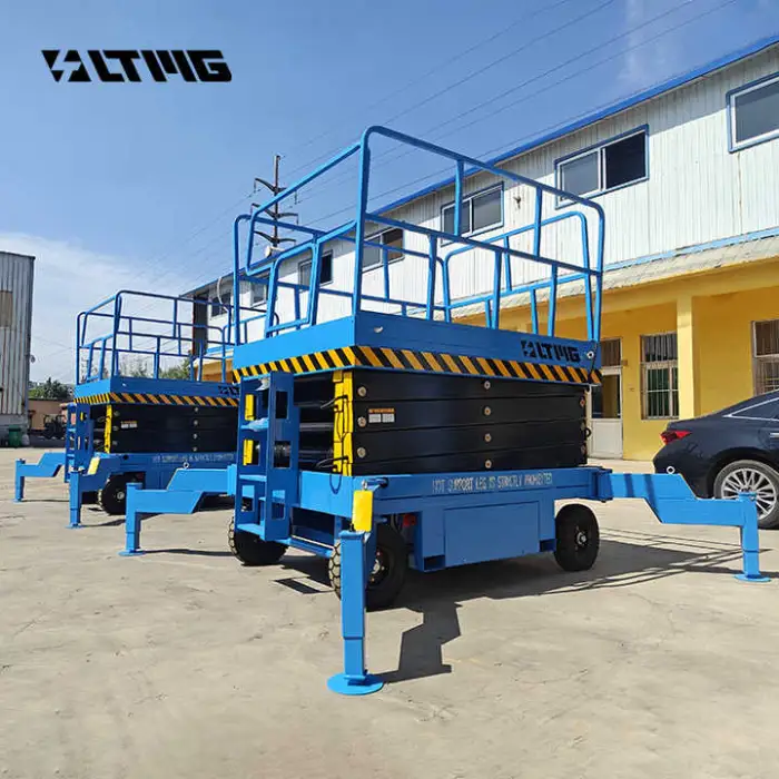 The lift is equipped with outriggers for enhanced safety and features a push-button control for user-friendly operation.