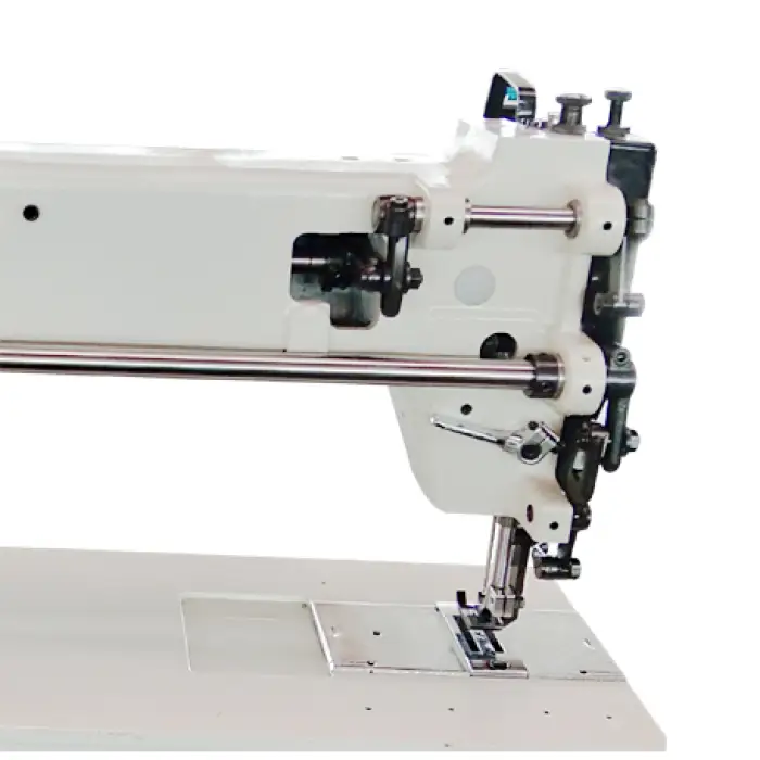 The top and bottom feed mechanism allows for better control and feeding of heavy materials, ensuring more precise stitching results.