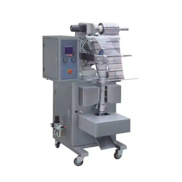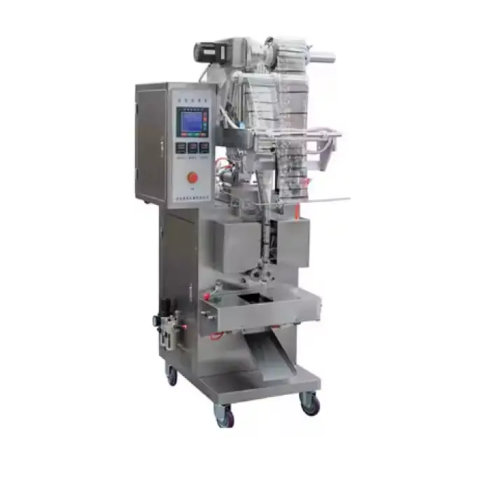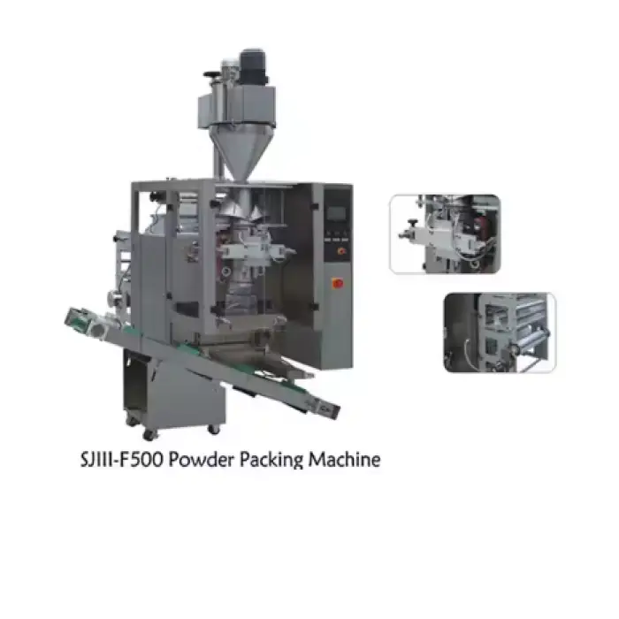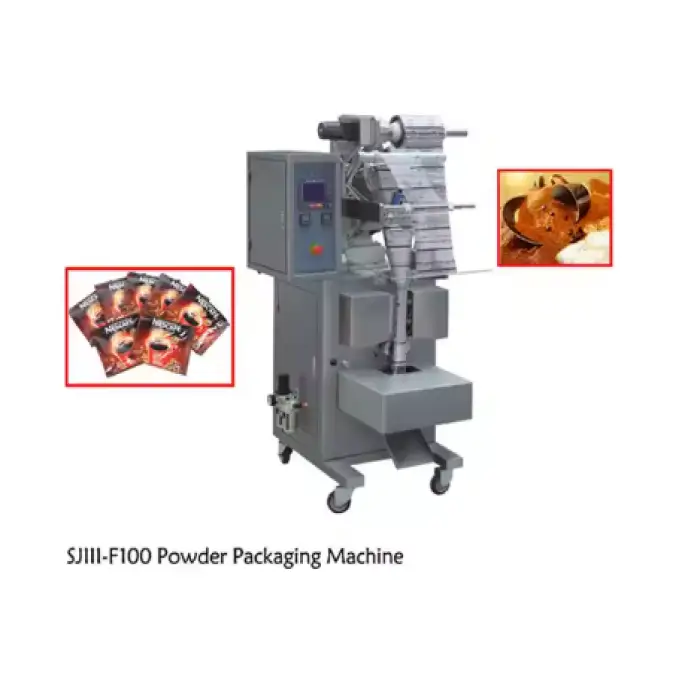 The F 100 Multi Function Tea Washing Powder Weighing Filling Packing Machine operates on a voltage of 220V.