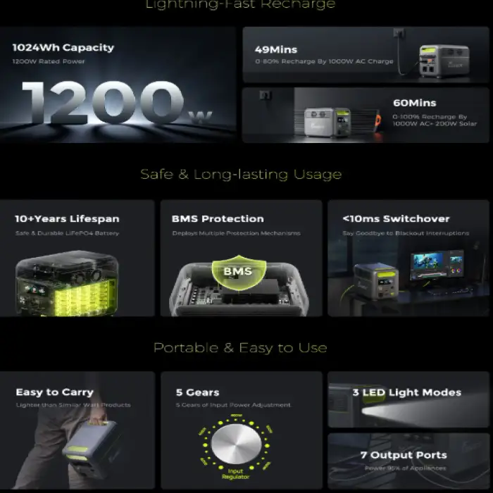 The F1200 includes features such as Type C charging, a flashlight, RV port, and a cigar lighter.