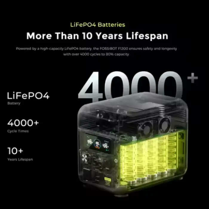 The F1200 is equipped with a LiFePO4 battery, known for its long-lasting power and safety.