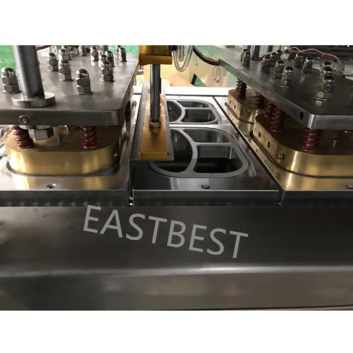 The machine automatically fills the trays with food and seals them, streamlining the packaging process.