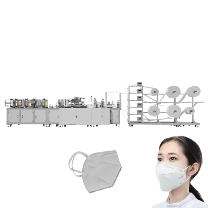 The machine is primarily designed for KN95-style masks. With appropriate tooling and configuration it can also be adapted to produce other cup/2D-folding respirator styles (N95/FFP2/FFP3-like designs), subject to mold/fixture changes and process validation.