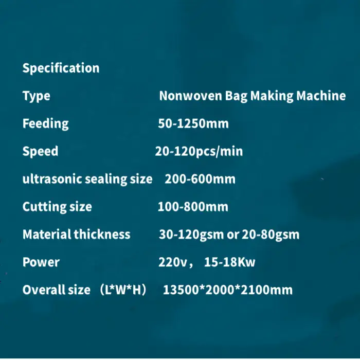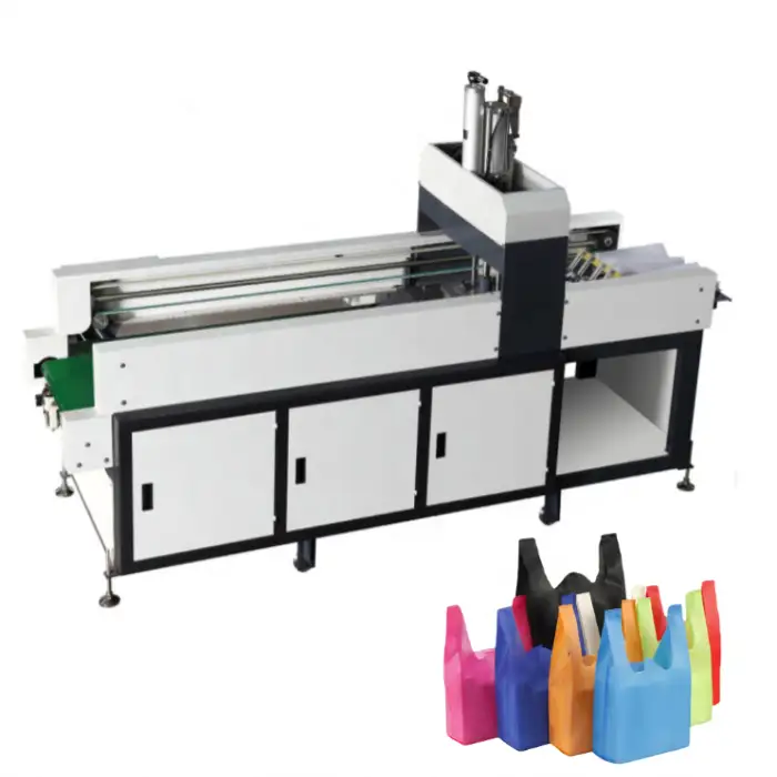 The machine can produce various types of non-woven bags, including shopping bags, t-shirt bags, box bags, and shoe bags.