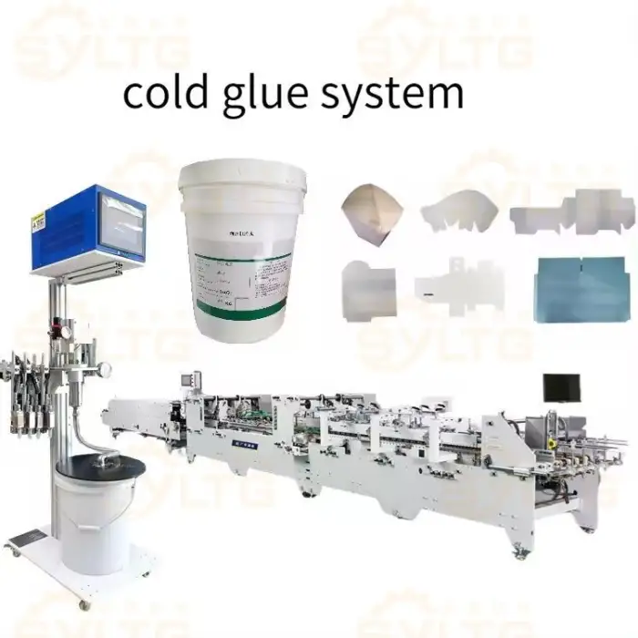 The Folder-Gluer Intelligent Cold Glue System features advanced technology that allows for precise control over the gluing process, ensuring accuracy in both point and line spray applications.