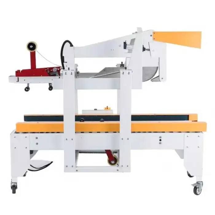 It's a semi-automatic machine for efficiently sealing small cartons and cases — ideal for food (including dairy), beverages, apparel, textiles, chemicals, hardware and other commodity packaging.