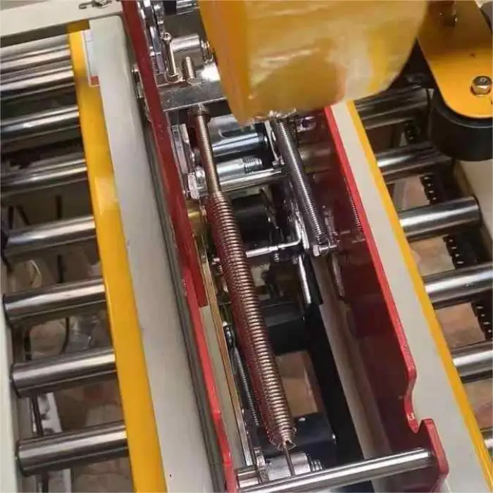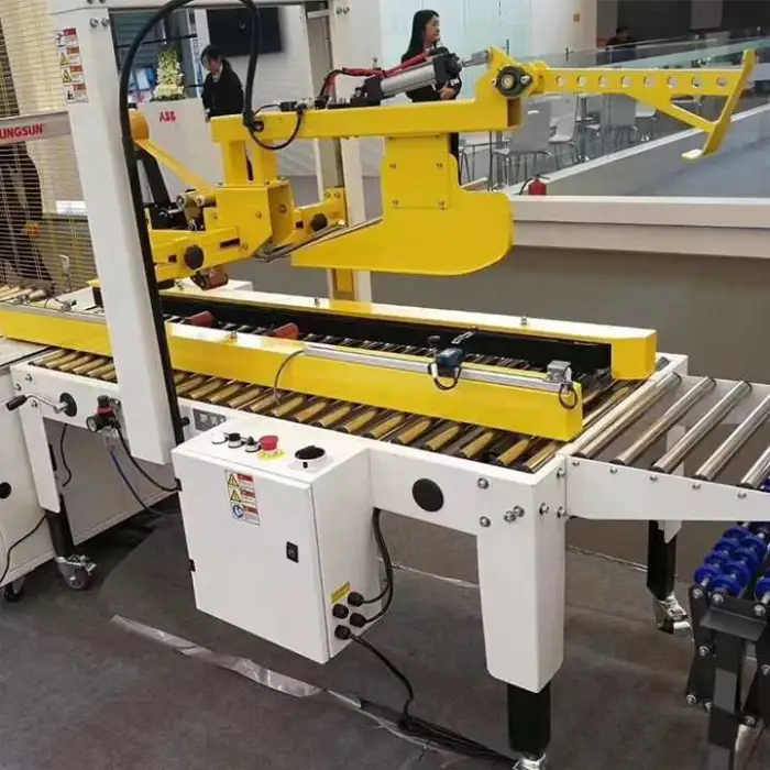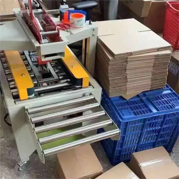 The machine is semi-automatic: an operator places the carton and the machine performs the tape sealing operation, improving speed and consistency over manual sealing.