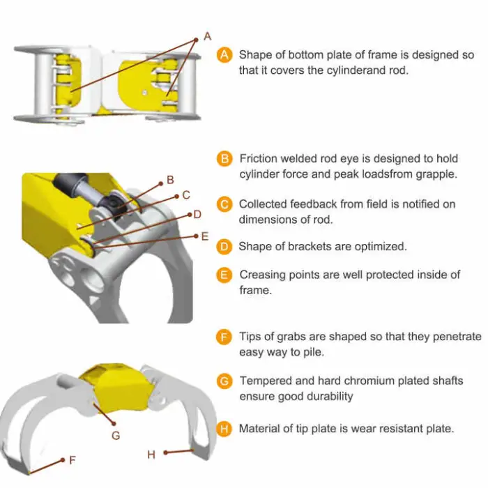 Key features include easy operation for efficient log handling, a robust design for durability, a rotating grapple for versatile movement, and a lightweight yet strong construction.
