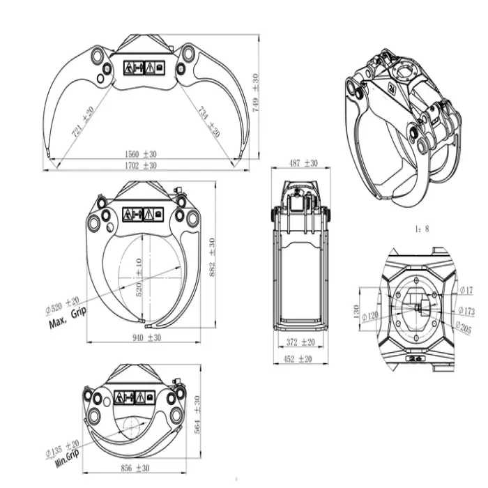 The dimensions of the log grabber are 856mm in length, 564mm in width, and 487mm in height.