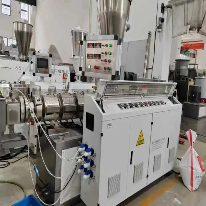 The machine features a double-screw design, which enhances the efficiency and quality of the extrusion process.