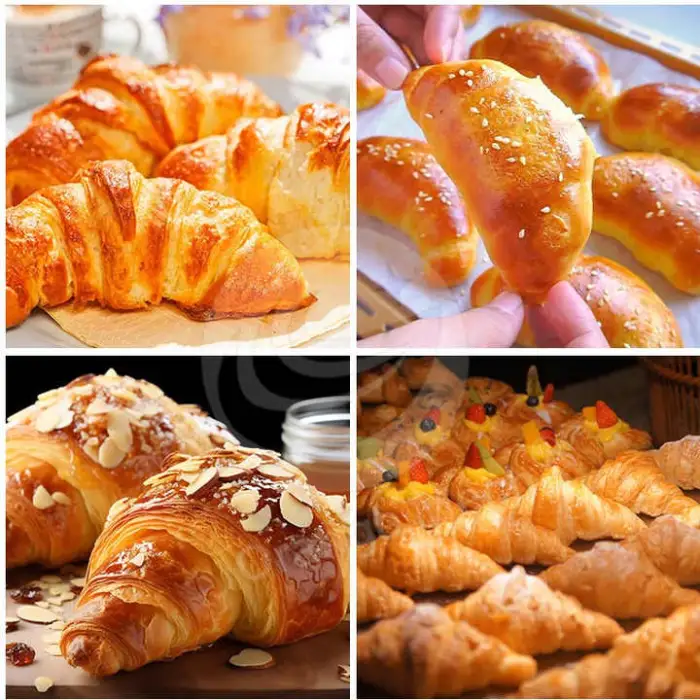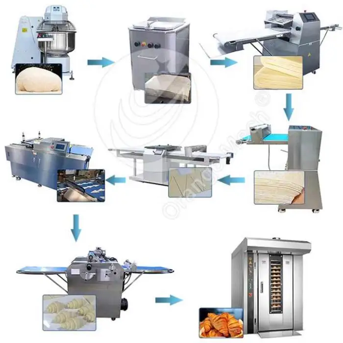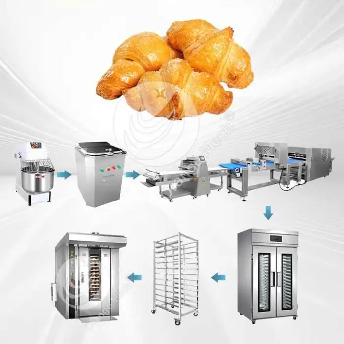 The machine has an output capacity of 100–200 kg of croissants per hour.