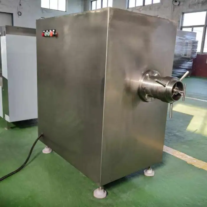 The machine is designed to grind frozen meat blocks, fish, chicken and vegetables, making it suitable for producing ground meat, fish paste, minced vegetables and pet food from fresh ingredients.