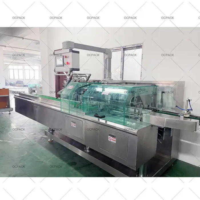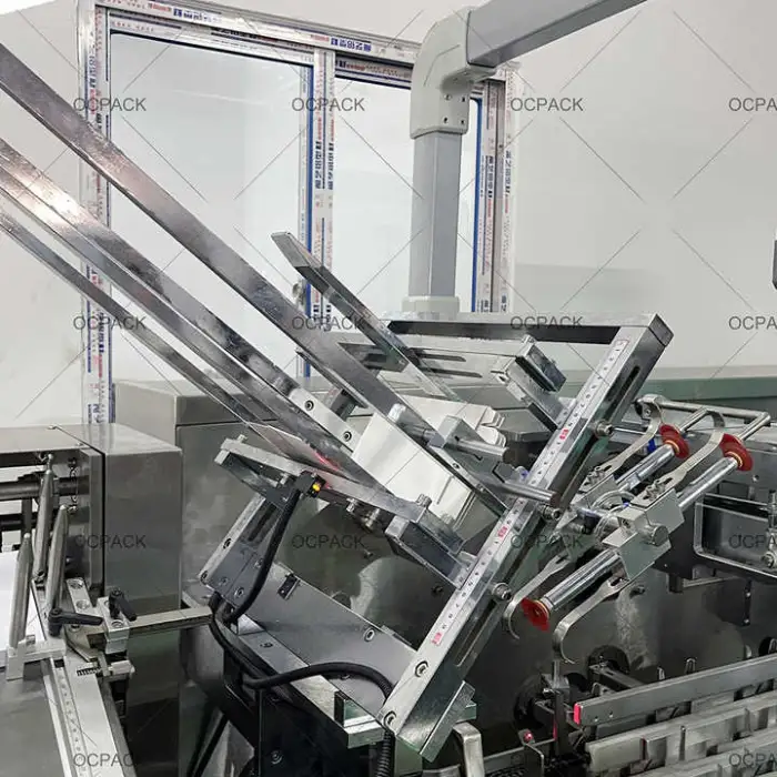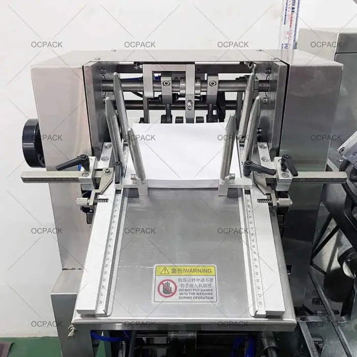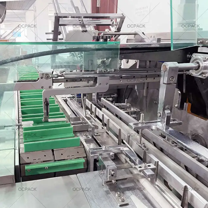 The machine primarily uses paper for packaging, specifically carton boxes.