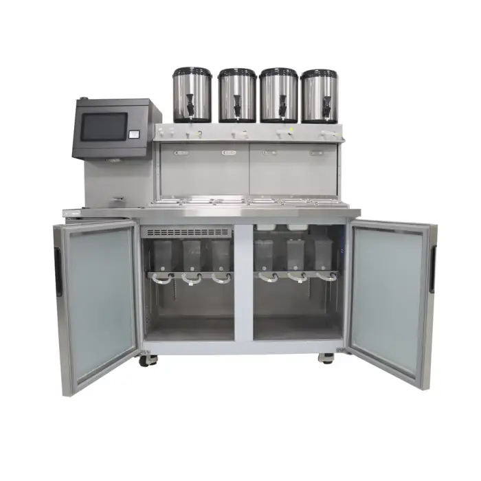 The machine dispenses tea at a speed of 55ml/s, milk at 50ml/s, syrup at 40ml/s, and jam at 25ml/s, allowing for quick service.