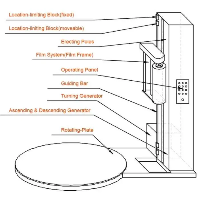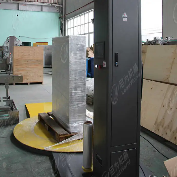 The machine operates automatically to wrap products securely using stretch film, streamlining the packaging process.