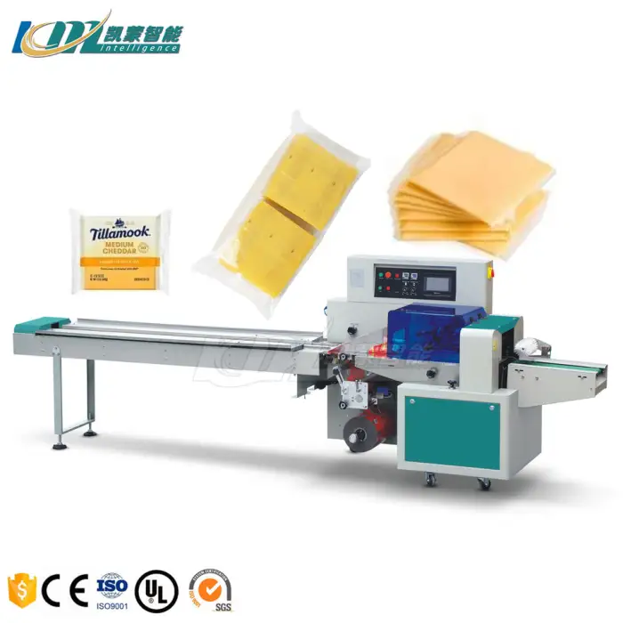 The machine is specifically designed for packaging dairy products like bagged cheese slices, but it can also handle various solid items, beverages, chemicals, and general commodity packaging needs.