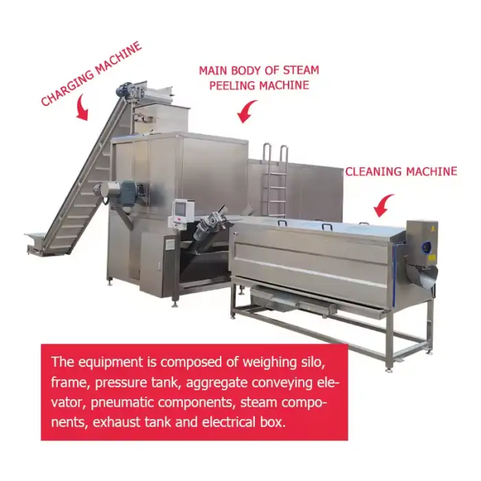 The production line includes a fruit and vegetable peeling machine among other essential components.